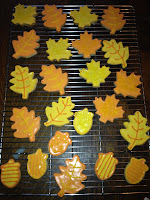 I really enjoy the sugar cookie recipe that is included in the book: the dough is not too sweet and very easy to handle - and I LOVE the suggestion of rolling the dough between sheets of wax paper. This helps maintain a clean surface and a clean rolling pin. The dough is the perfect consistency and after just 30 minutes in the refrigerator it is ready to cut into shapes. I decided to go with a fall theme, and the recipe made about 2.5 dozen leaves and a dozen acorns. The perfect amount for our small family. I would anticipate that the recipe could be easily doubled to accommodate a large holiday get together.